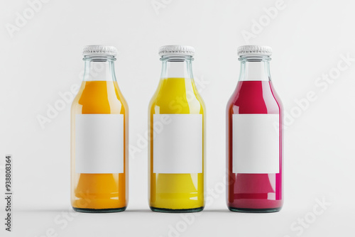 Three bottles of juice with a white label. The bottles are in a row and are all different colors