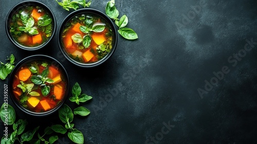 Three bowls of vegetable soup, overhead shot, dark background, food blog use