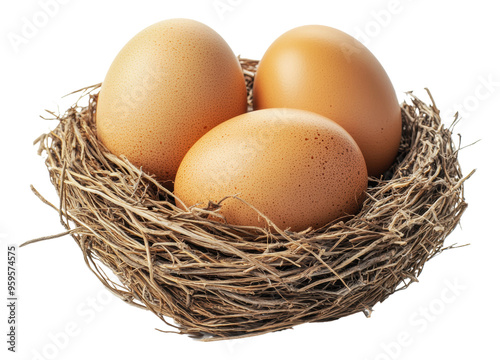Three brown eggs nestled in a grass nest, cut out - stock png.