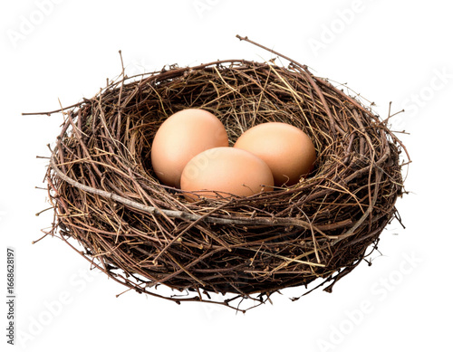 Three brown eggs nestled in natural bird nest made of twigs and straw