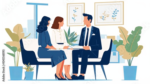Three business professionals are engaged in a meeting, sitting on a couch in a modern office, representing collaboration and professionalism.