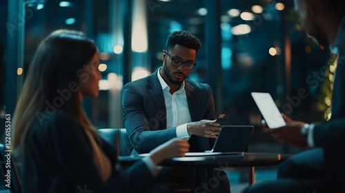 Three Business Professionals Engaged in a Meeting at a table in an office setting