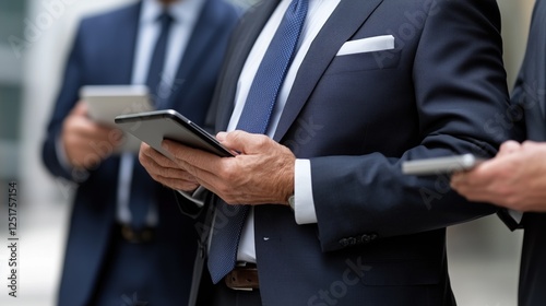 Three business professionals stand outdoors, dressed in formal suits, engaged in a discussion while interacting with their tablets under natural light amidst a city backdrop