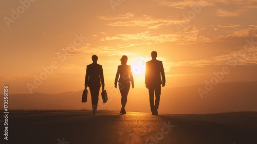 Three business professionals walk confidently towards a beautiful sunset with briefcases in hand silhouetted against a warm sky conveying a sense of ambition and determination.