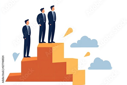 Three businessmen stand confidently on a staircase, symbolizing success, progress, and achievement in a professional setting.