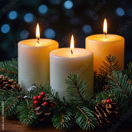 Three candles are nestled within the branches of a Christmas tree, casting a warm glow amidst the evergreen needles, creating a festive and cozy atmosphere