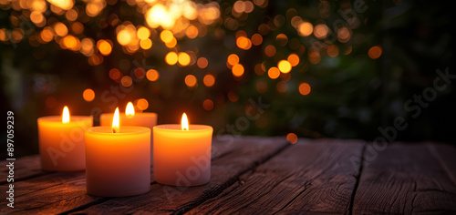 Three candles, lit for Rosh Hashanah, illuminate a rustic wooden table with a backdrop of twinkling lights