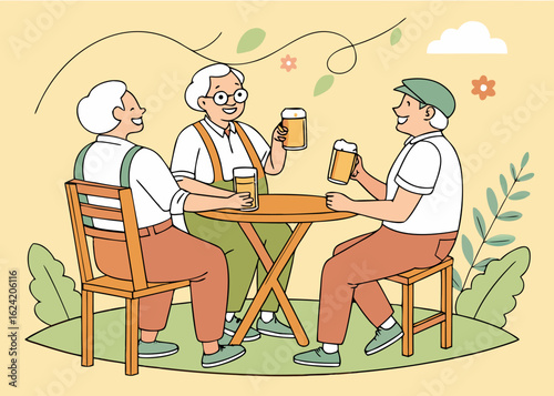 Three cheerful friends enjoying drinks at a summer festival in Beer garden , seated around a wooden table, surrounded by greenery and a bright, sunny atmosphere, celebrating friendship and joy