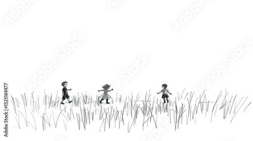 Three children run joyfully through tall grass in a serene countryside enjoying a sunny day filled with laughter and playfulness in a beautiful landscape