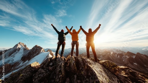 Three climbers stand victoriously with arms raised on a rugged mountainous peak, symbolizing triumph, teamwork, and the spirit of adventure against a dramatic sky.