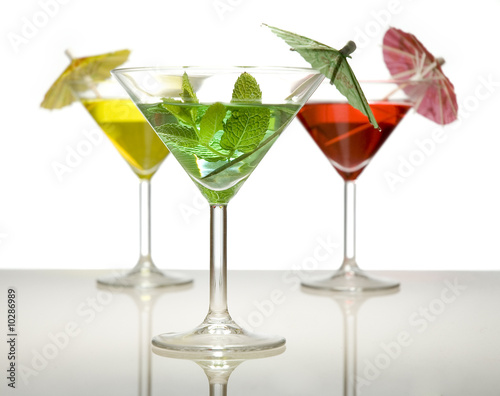three cocktails with umbrella isolated on a white background