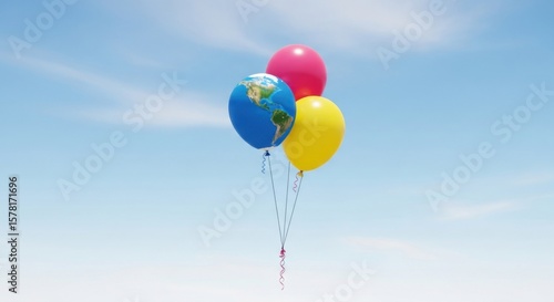 Three Colorful Balloons Floating in the Sky With Confetti Falling Down