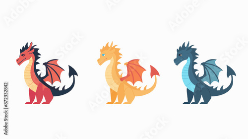 Three colorful cartoon dragons. Fantasy dragon character vector set isolated on a white background.