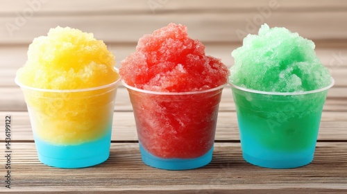 Three colorful cups of shaved ice in yellow, red, and green flavors on a wooden surface.