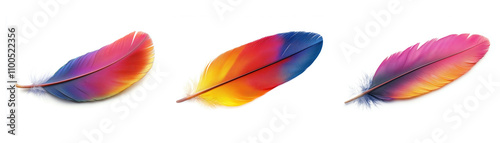 Three colorful feathers isolated on white background, vibrant and artistic elements