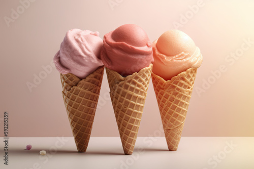 Three colorful ice creams on light background. Ice Cream scoops in waffle cones. Sweet desserts. Generative AI