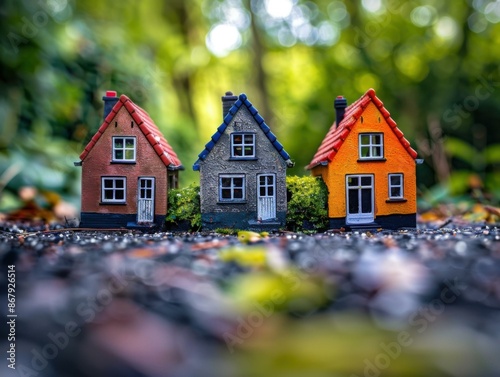 Three colorful miniature houses sit on a textured surface surrounded by blurred greenery. AI.
