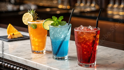 Three colorful refreshing cocktails on a bar counter with garnishes
