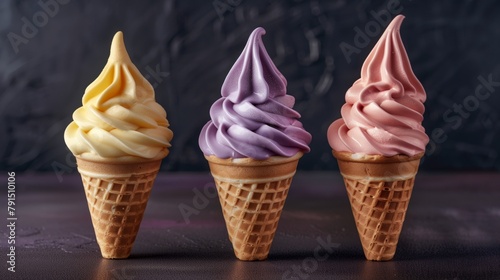 Three colorful soft serve ice creams in waffle cones on a dark background