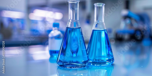 Three conical flasks with blue liquid in a science laboratory.