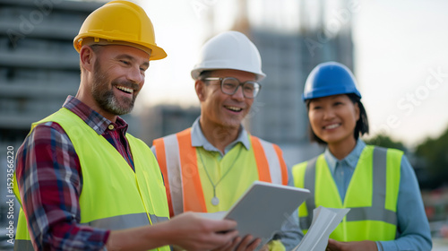 Three construction workers in safety gear discussing building plans using a digital tablet at a construction site.