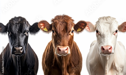Three cows of different colors against a white background.