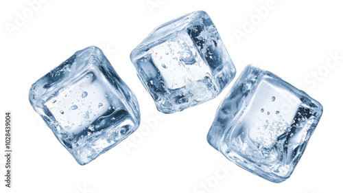 Three crystal-clear ice cubes isolated on a white background, perfect for cooling beverages and culinary presentations, transparent background.