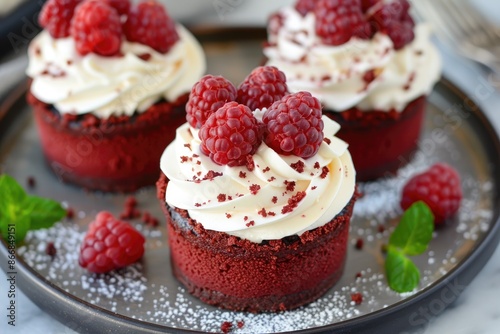 Three cupcakes with whipped cream and raspberries on top. The cupcakes are placed on a black plate with a white border