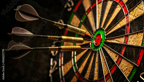 Three darts in triple twenty on professional sisal steeldart. perfect 180 highscore shot dart game hobby sport concept background