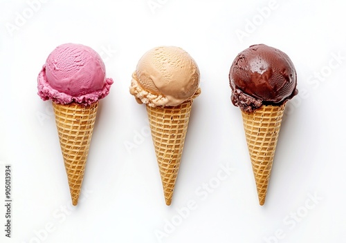 Three delicious ice cream cones in vanilla, chocolate, and mint flavors isolated on a white background. Generative ai