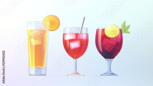 Three different beverages in glassware, ideal for foodie or party themes