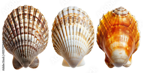 Three different types of sea shells are isolated on a empty background with a clipping path.