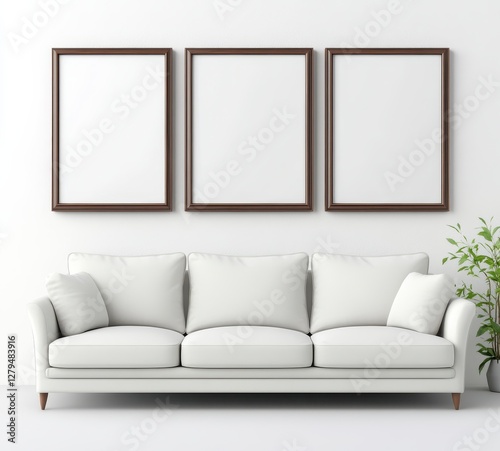 Three Empty Picture Frames Above White Sofa in Minimalist Interior