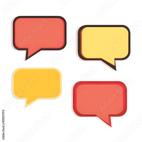 Three empty speech bubbles, vector graphics, simple shapes design, red, blue, and yellow color palette, white background design,