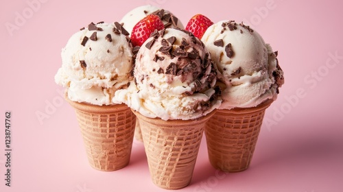 Three enticing ice cream scoops in cones, topped with strawberries and chocolate shavings, showcasing a delightful dessert perfect for warm days.