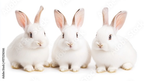 Three Fluffy White Rabbits Sitting Side by Side on White Background