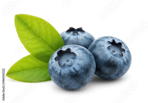 Three fresh blueberries with green leaves arranged on a clean white surface for a simple, natural display