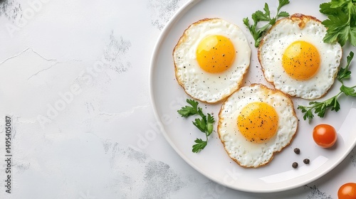 Three fried eggs are on a white plate with parsley and pepper. It can represent a healthy breakfast or cooking related concept.