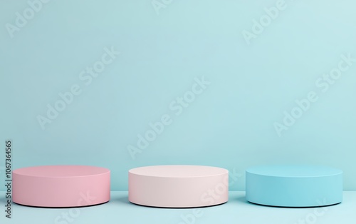 Three geometric podiums in pastel blue and pink tones, arranged symmetrically against a dreamy, softlit background, perfect for contemporary product display