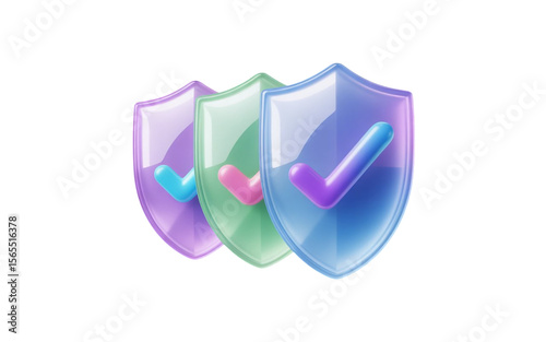 Three Glossy Pastel Shields with Checkmarks Security Protection and Approval Concept