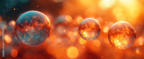 Three glowing orbs with fiery textures float amid bokeh, set against a warm, vibrant, blurred background