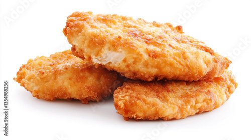 Three golden brown breaded chicken patties stacked on a white surface in a close up studio shot
