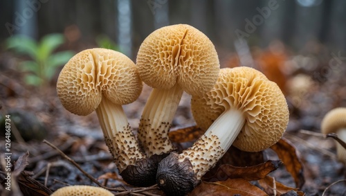 Three golden mushrooms on forest floor surrounded by leaves and soft focus background Copy Space
