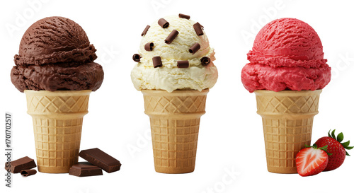 Three gourmet dark chocolate, vanilla bean with chocolate curls, and strawberry ice cream cones in crisp waffle cones on a transparent background. Concept of premium dessert