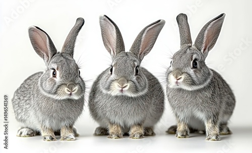 Three gray rabbits with upright ears sitting closely together against a white background, showing soft fur and attentive expressions