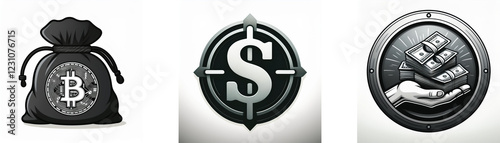 Three grayscale icons depict cryptocurrency, US dollar, and money. Each represents different forms of wealth and finance.