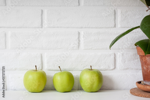 Three green healthy fresh apples against white brick wall background with scandinavian flower ficus beside. Country side farm fruit production. Vitamin A C. regeneration heart cells. Healthy lifestyle