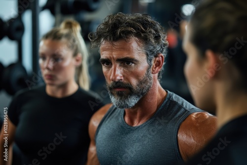 Three gym-goers engage in a focused conversation, perspiring and intent, highlighting the social aspect of fitness and the communal drive for self-improvement and discipline.