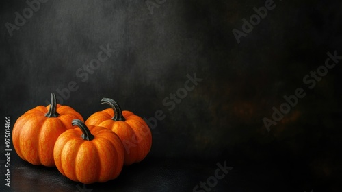 Three Halloween pumpkins with multicolored glow on a dark background. A picture with a place for text.