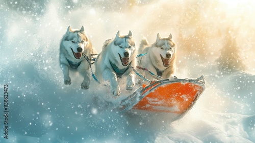 Three Huskies pulling sled in Arctic blizzard dynamic composition